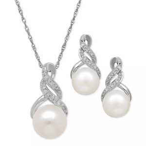 Cultured Freshwater Pearl (8 & 9mm) and Diamond Accent Pendant Necklace and Earrings Set in Sterling Silver or 14k Gold Over Silver
