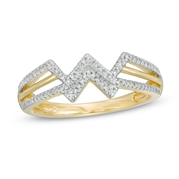 Crafted in warm 10K gold, this ring features a diamond-lined ribbon at the center. The polished ribbon completes the split, three-row setting. This ring features 1/8 carat diamonds polished to a brilliant shine for a bold statement.