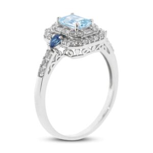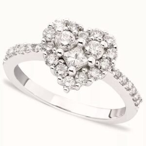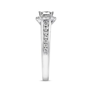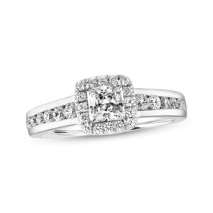 Dazzling rows of round diamonds surround a spectacular radiant-cut diamond center to create the main attraction in this stunning bridal. The 14K white gold band of the engagement ring and matching wedding ring gleam with twinkling diamonds, bringing the total diamond weight of the bridal set to 1 1/8 carats.