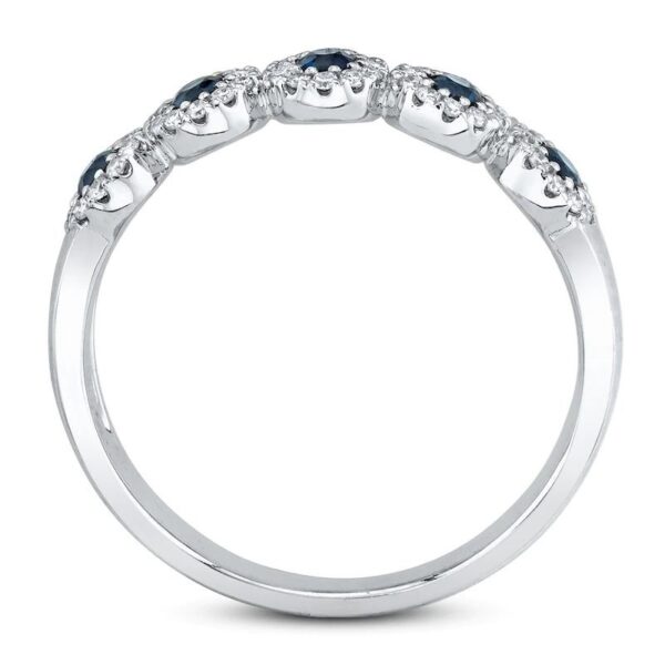 Features round natural sapphires outlined in shimmering round diamonds. Fashioned in 14K white gold, the ring has a total diamond weight of 1/8 carat.